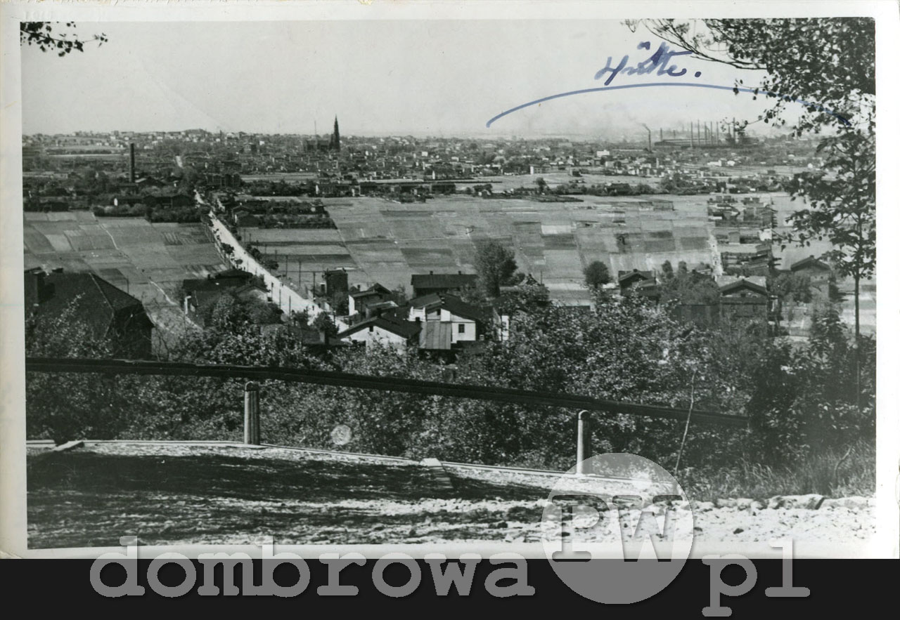 Dąbrowa Górnicza podczas okupacji hitlerowskiej . Pocztówka z okresu II Wojny Światowej wydana przez wydawnictwo Graphochemie z Katowic. Widok na Dąbrowę Górniczą z Górki Gołonoskiej. Na zdjęciu widoczny fragment starej zabudowy Gołonoga, a w oddali pełna panorama Dąbrowy. Osoba wysyłająca pocztówkę zaznaczyła na niej Hutę Bankową.