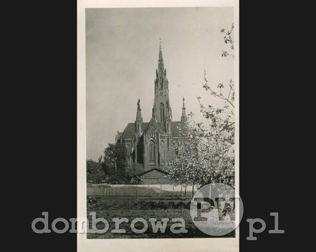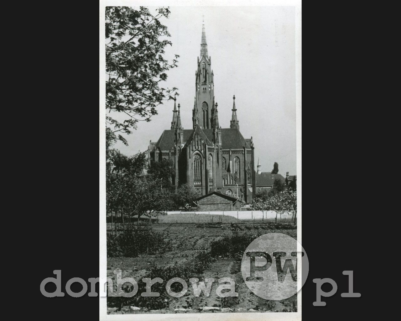 Dąbrowa Górnicza podczas okupacji hitlerowskiej . Pocztówka z okresu II Wojny Światowej wydana przez wydawnictwo Graphochemie z Katowic. Widok na Kościół Matki Boskiej Anielskiej "od zaplecza".