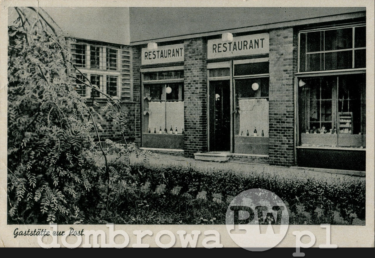 Pocztówka z okresu II Wojny Światowej wydana przez wydawnictwo Hannsa Kanngiessera w Łodzi. Dąbrowa Górnicza podczas okupacji hitlerowskiej. Zdjęcie przedstawia wnętrze przylegającą do Poczty restaurację której właścicielem był nijaki H. Brotkowski. Bardzo prawdopodobne, że na zdjęciu znajduje się sam właściciel.