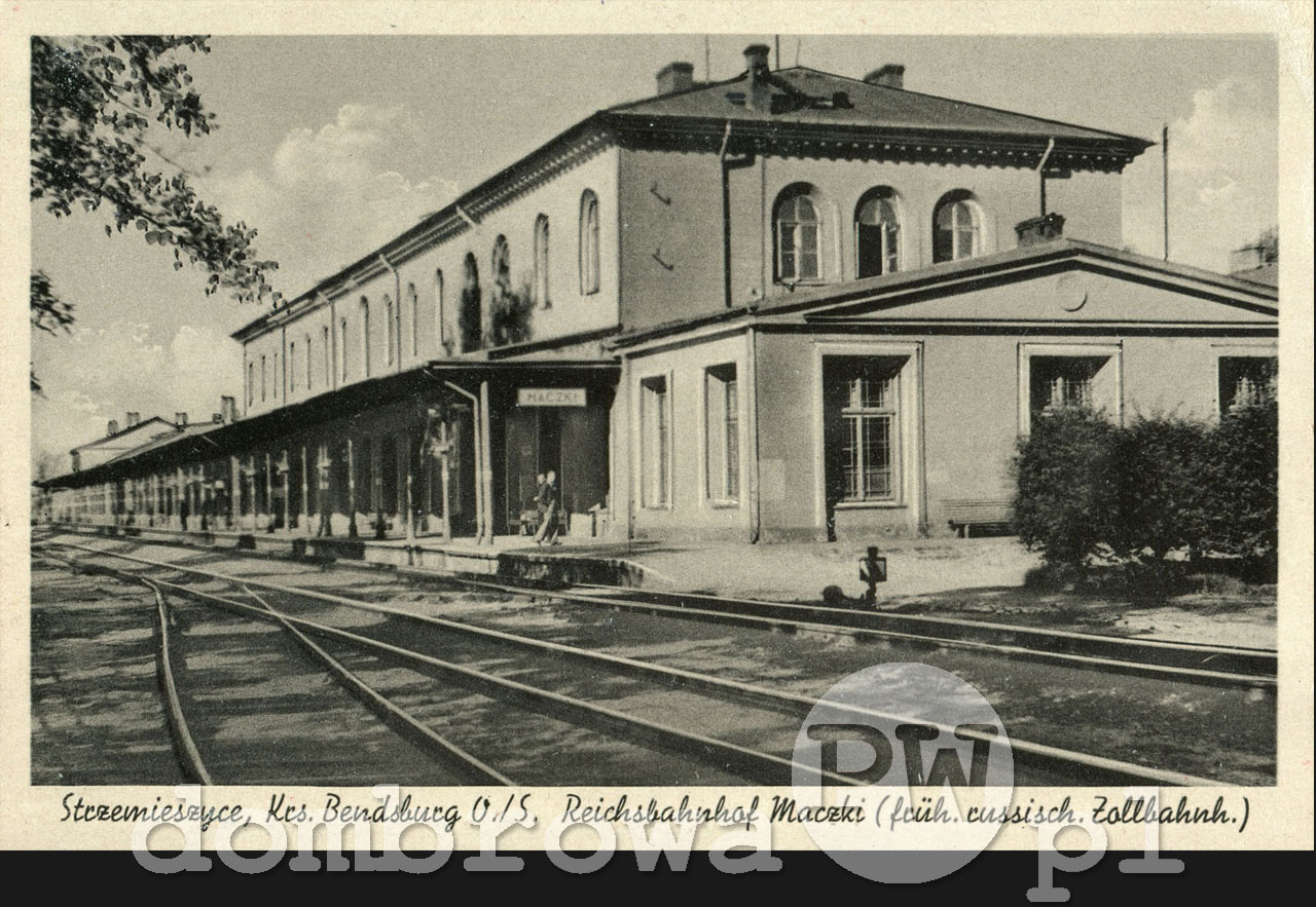 Pocztówka z okresu II Wojny Światowej wydana przez wydawnictwo Hannsa Kanngiessera w Łodzi. Dworzec w Maczkach. Podczas okupacji Maczki wchodziły w skład Gminy Strzemieszyce.